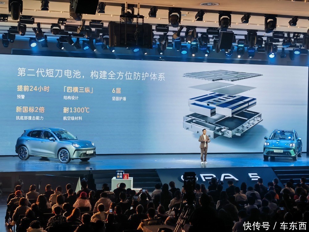 长城欧拉5搭载了抗挤压强度达国标2倍的磷酸铁锂二代短刀电池,融合AI技术,若电池异常可提前24小时预警。在被动安全方面,长城欧拉5则配备了对标欧洲标准的双腔远端气囊。